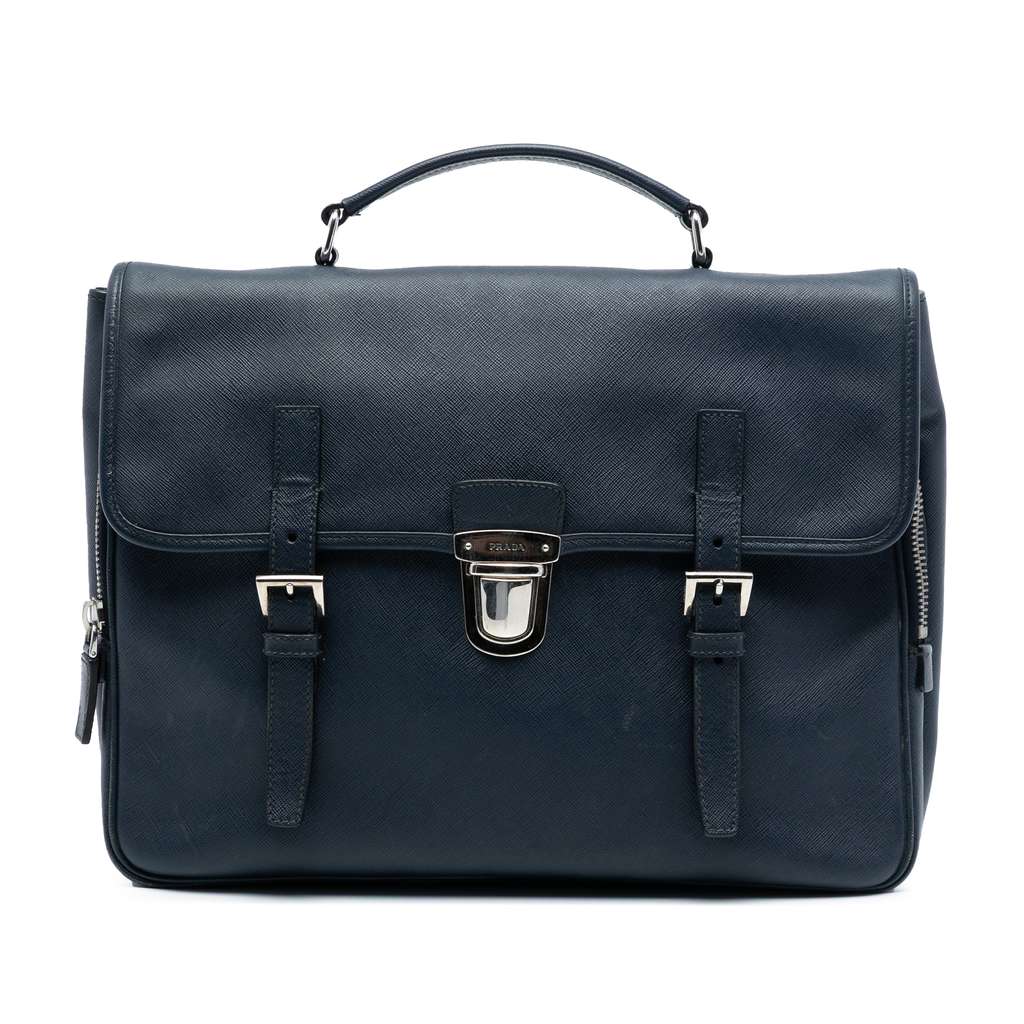 This briefcase features a saffiano leather body, a flat leather top handle, a front flap closure with a push lock and metal buckle closures, exterior zip pockets, and interior zip and slip pockets.
