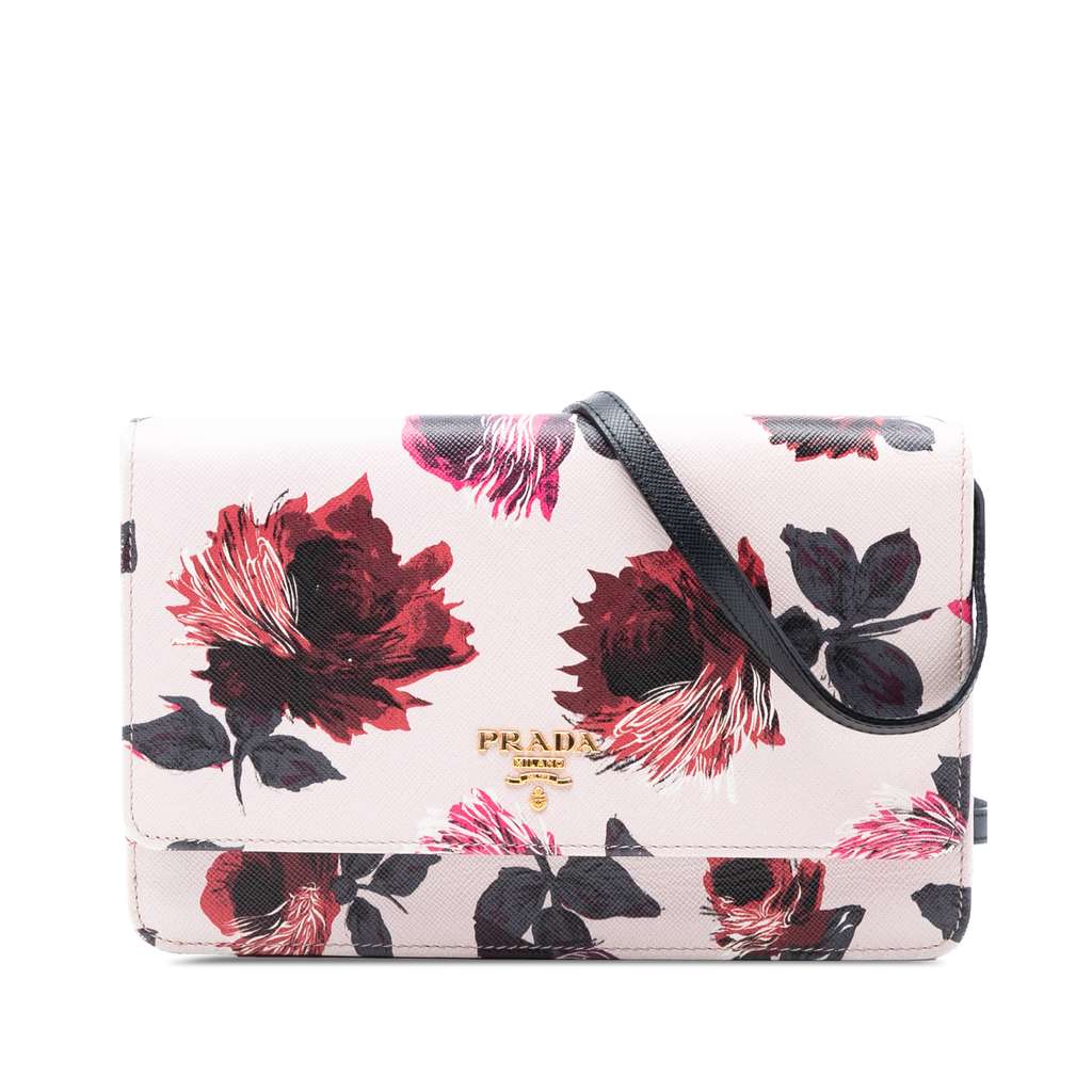 Prada Saffiano Floral Print Wallet on Strap Pink Small Leath