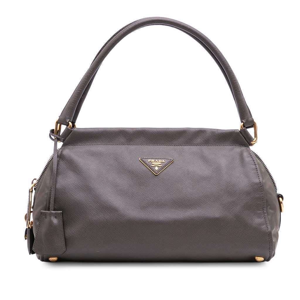 This handbag features a saffiano leather body, rolled leather handles, a top zip closure, and interior zip and slip pockets.