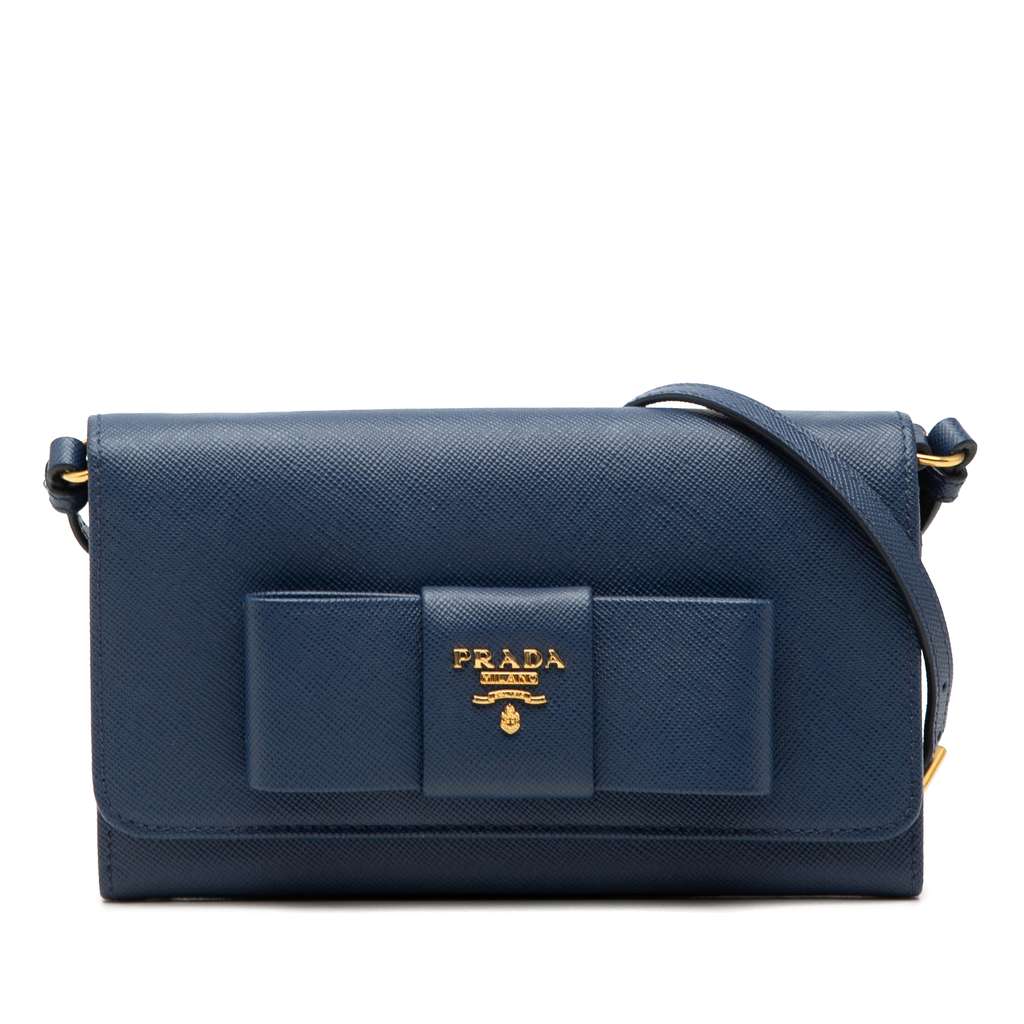 Prada Saffiano Lux Bow Wallet On Strap Blue Mini Leather