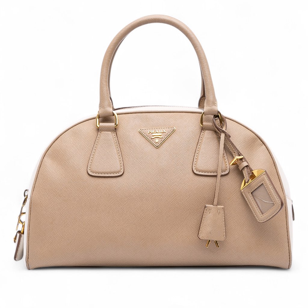 This handbag features a saffiano leather body, rolled leather handles, a top zip closure, and interior zip and slip pockets. Handles has been repainted.