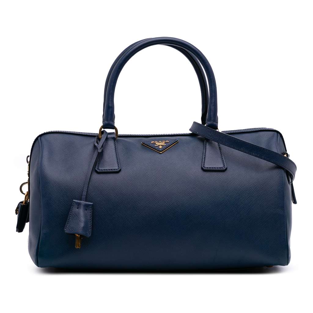 This satchel features a saffiano leather body, rolled leather handles, a detachable flat strap, a top zip closure, and interior zip and slip pockets. Exterior back, corners and side has been repainted.