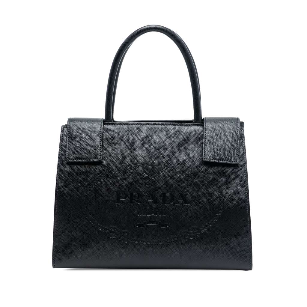 This satchel features a saffiano leather body, rolled leather handles, an open top with flap and magnetic snap closures, and interior zip and slip pockets.