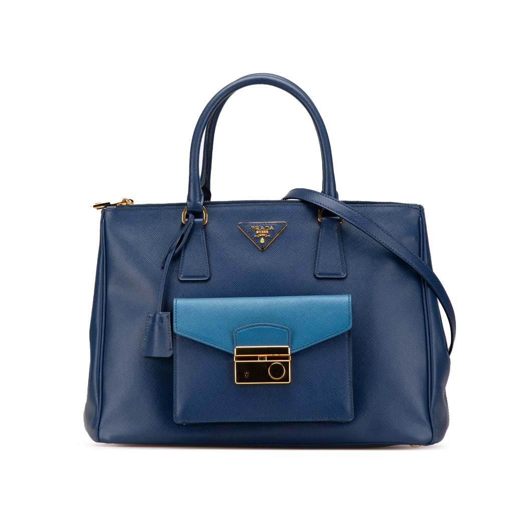 This satchel features a saffiano leather body, rolled leather handles, an open top, interior zip compartments, an exterior front flap pocket, and interior zip and slip pockets.