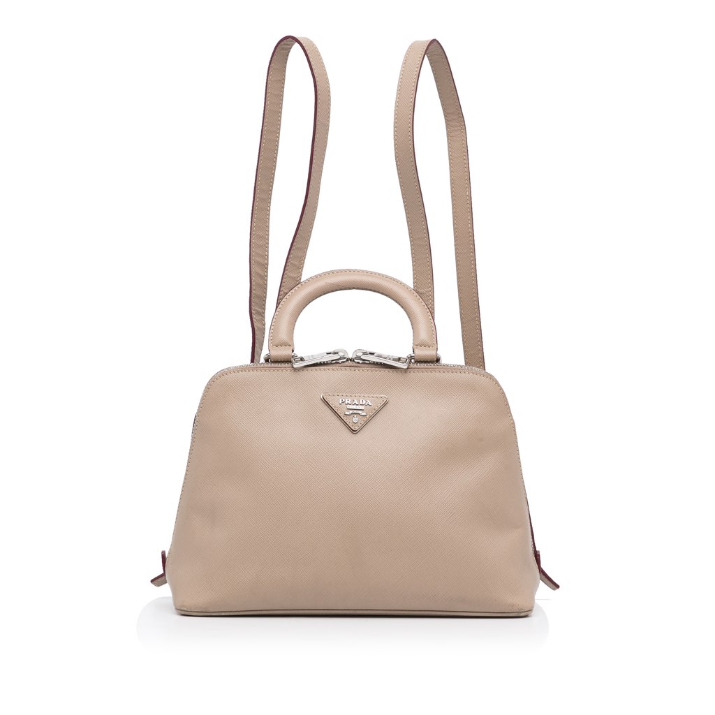 The Lux Promenade backpack features a saffiano leather body, a rolled top handle, flat leather back straps, and a top zip around closure.