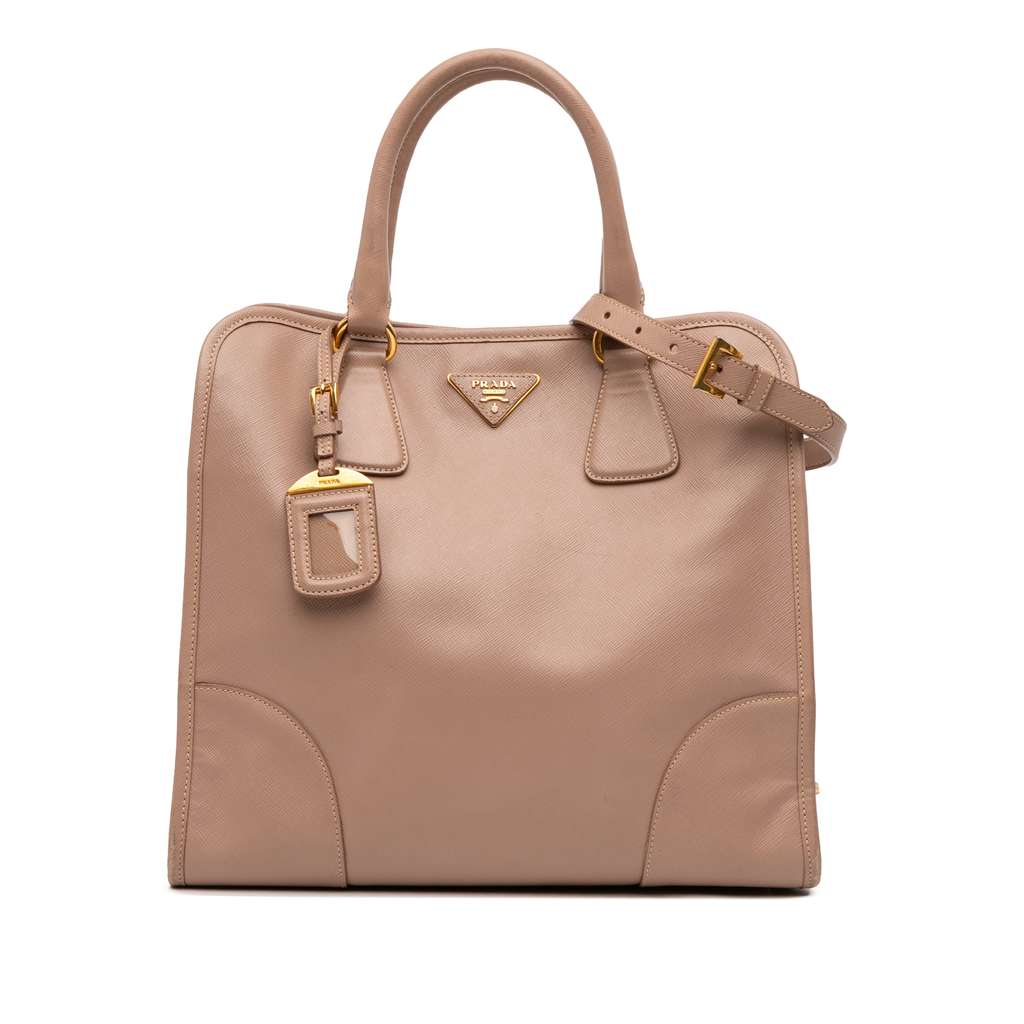 This satchel features a saffiano leather body with leather trim, rolled leather handles, a detachable and adjustable shoulder strap, an open top with magnetic snap closure, and interior zip and slip pockets.