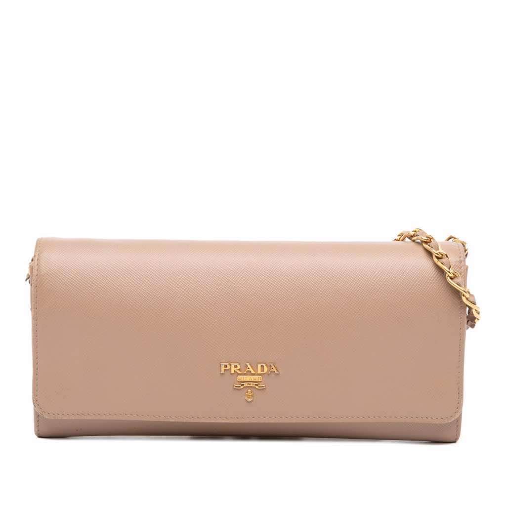 This wallet on chain features a saffiano leather body, a leather woven chain strap, a front flap with a snap button closure, and interior zip and slip compartments.
