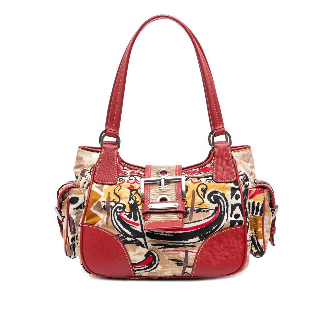 This shoulder bag features a printed canvas body with saffiano leather trim, flat leather straps, a top strap with magnetic snap closure, exterior side flap pockets, and an interior zip pocket.