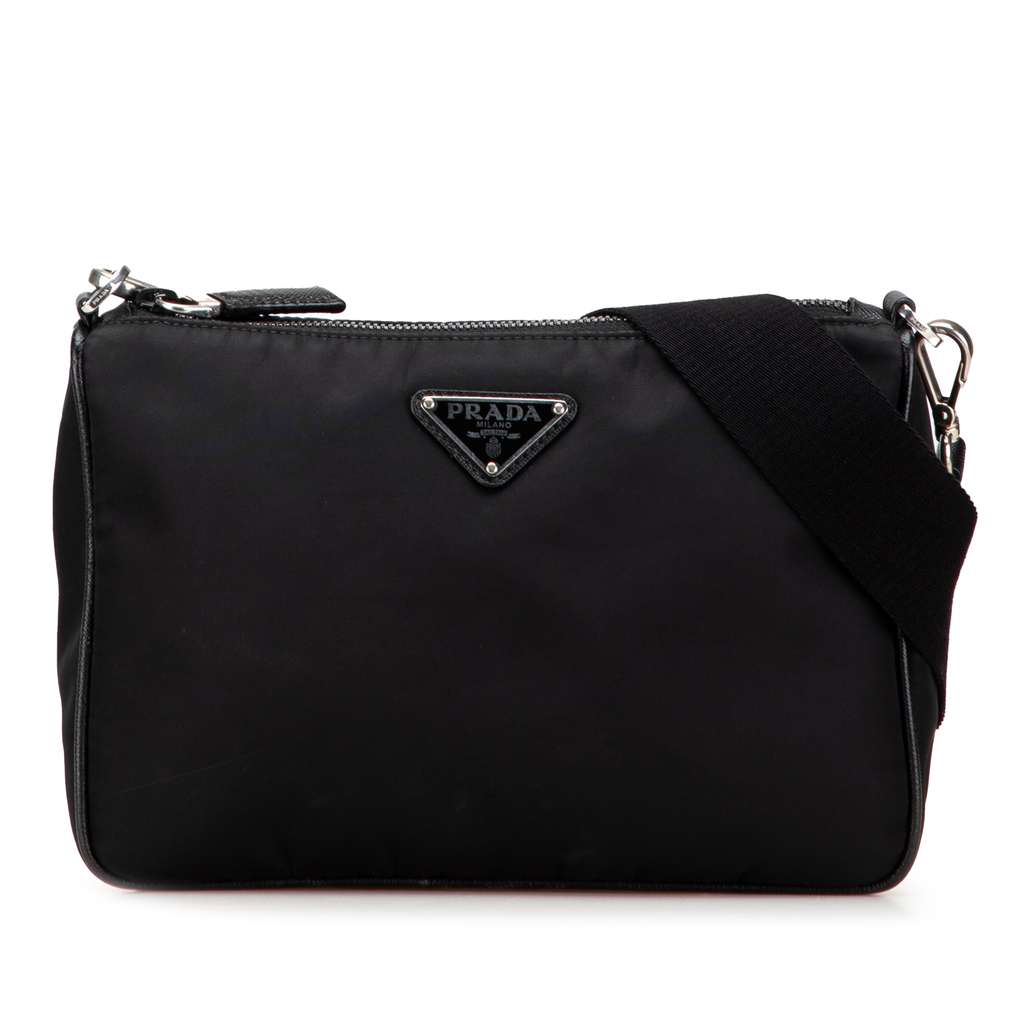 This crossbody bag features a nylon body, a detachable strap with a removable pouch attachment, and a top zip closure.