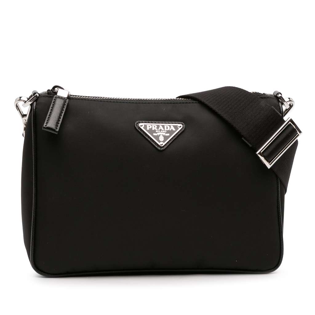 This crossbody bag features a nylon body, a detachable strap with a removable pouch attachment, and a top zip closure.