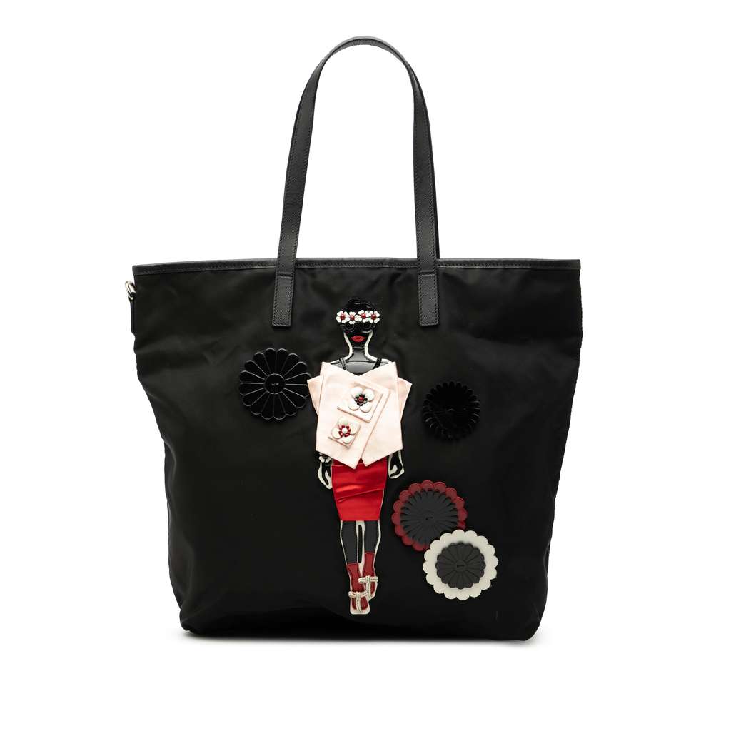 This tote bag features a nylon body with saffiano leather trim, flat leather straps, an open top with magnetic snap closure, and interior zip and slip pockets.