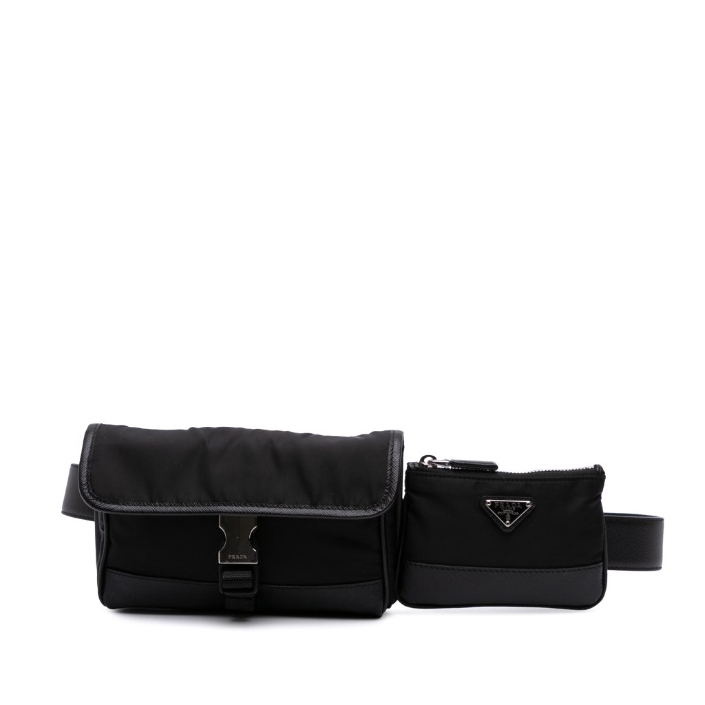 This belt bag features a nylon body with leather trim, front flap compartments with buckle closure, a flat waist strap with a buckle closure, a coin pouch and an interior zip pocket.