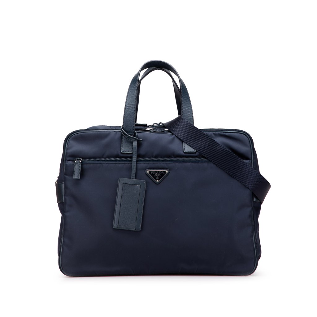 This business bag features a nylon body with saffiano leather trim, flat leather top handles, a detachable shoulder strap, a top zip closure, an exterior front zip pocket, an exterior back slip pocket with touch fastener closure, and interior zip and slip pockets.