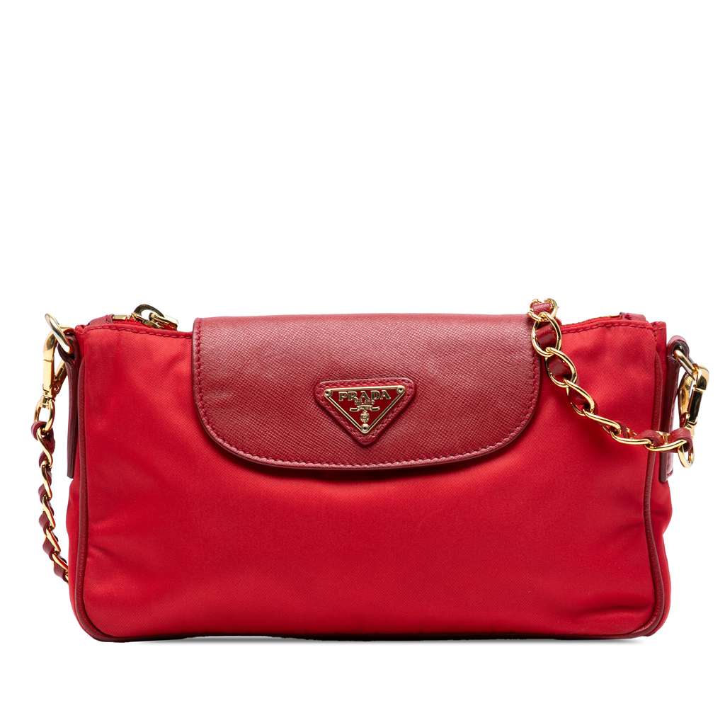 This crossbody bag features a nylon body with saffiano leather trim, a top zip closure with a flap and snap button closure, a leather woven chain shoulder strap, and interior zip and slip pockets.