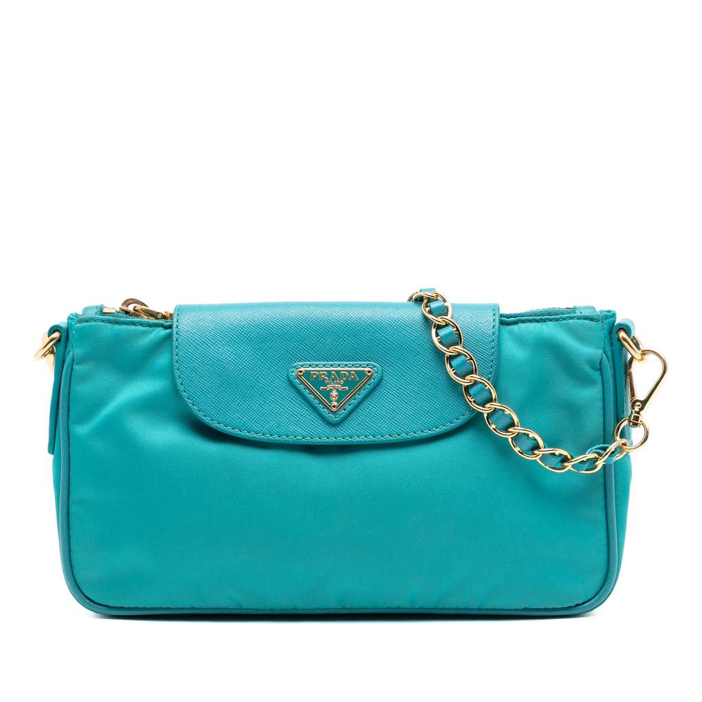This crossbody bag features a nylon body with saffiano leather trim, a top zip closure with a flap and snap button closure, a leather woven chain shoulder strap, and interior zip and slip pockets.