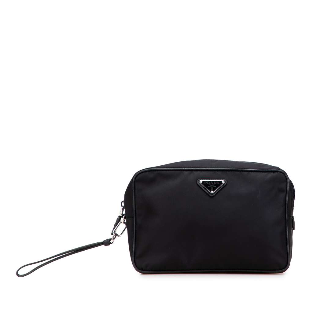 This clutch bag features a nylon body, a detachable flat leather wrist strap, a top zip closure, an exterior back zip pocket, and an interior zip pocket.