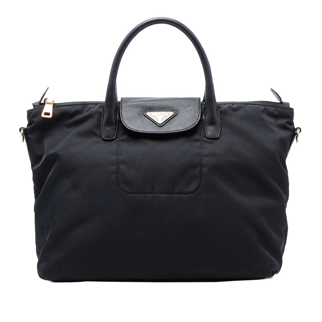 This satchel bag features a nylon body with saffiano leather trim, rolled leather handles, a top zip closure with a flap and snap button closure, and interior zip and slip pockets.