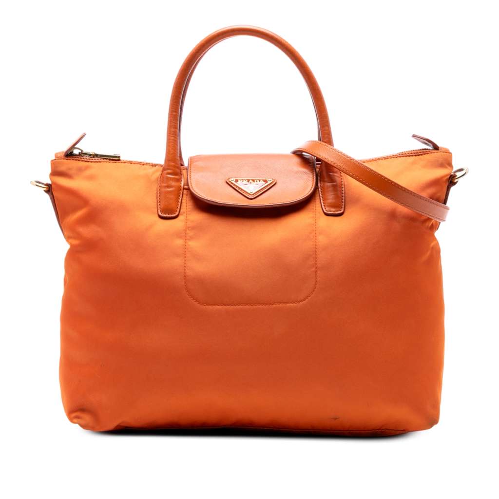 This satchel features a nylon body with saffiano leather trim, rolled leather handles, a detachable flat leather strap, a top strap with snap button closure, and interior zip and slip pockets.