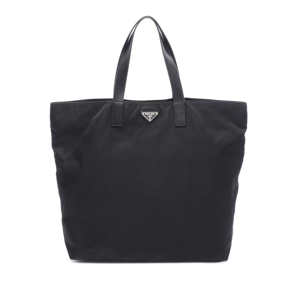 This tote bag features a nylon body with saffiano leather trim, flat saffiano leather straps, an open top with magnetic snap closure, and interior slip and zip pockets.