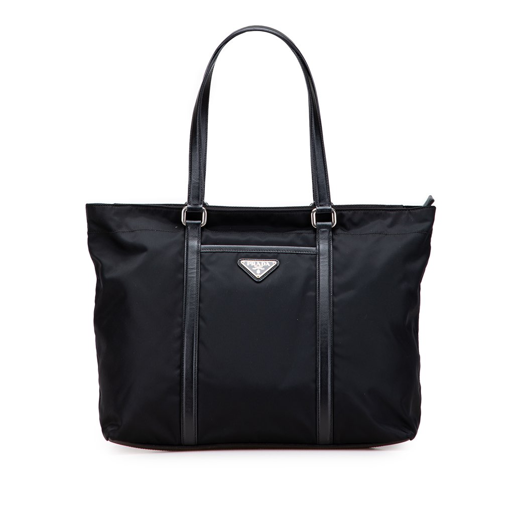 This tote bag features a nylon body with saffiano leather trim, flat leather straps, a top zip closure, an exterior front slip pocket, and an interior zip pocket.