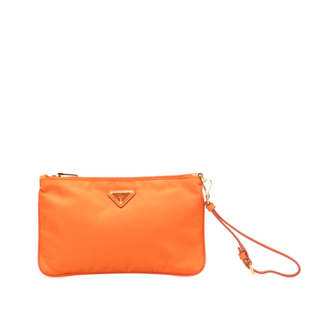 This pouch features a nylon body with saffiano leather trim, a flat leather wrist strap, a top zip closure, and an interior zip pocket.