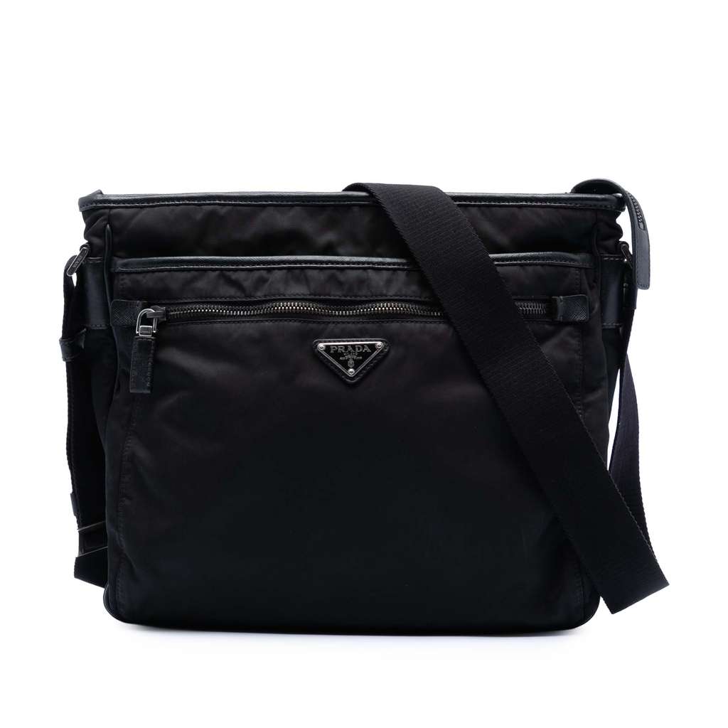 This crossbody bag features a nylon body with saffiano leather trim, an adjustable flat strap, a top zip closure, exterior front zip and slip pockets, and an interior zip pocket. Exterior top and side have been repainted.