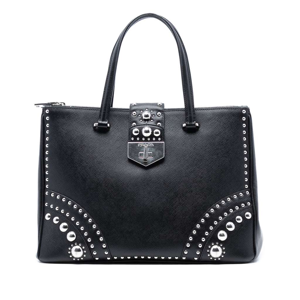 This satchel features a studded saffiano leather body, flat leather handles, a detachable flat leather strap, top zip closure compartments, an open top with studded leather tab and turn-lock closure, and interior zip and slip pockets. The corners were repainted.