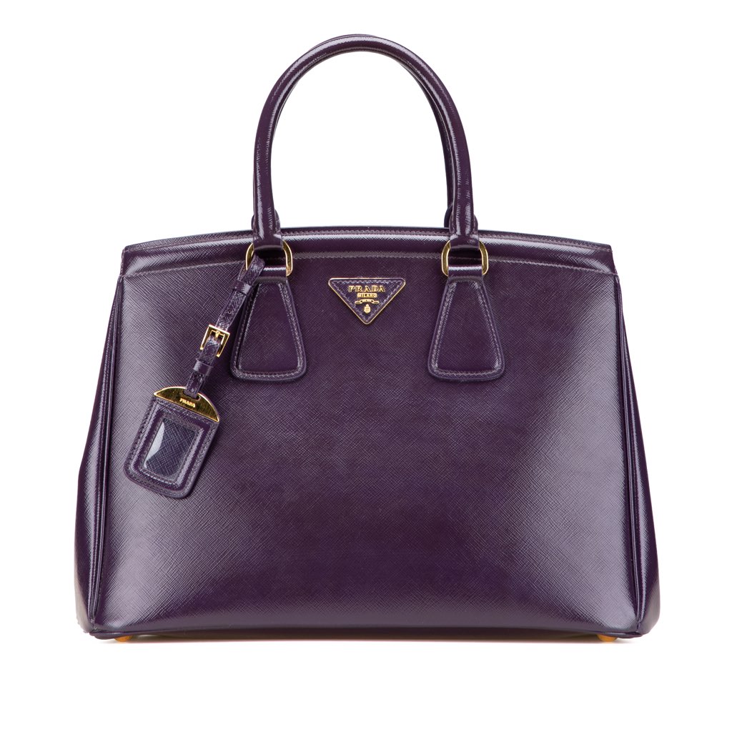 The Parabole features a patent saffiano leather body, rolled handles, an open top, an interior zip compartment, and interior zip and slip pockets.