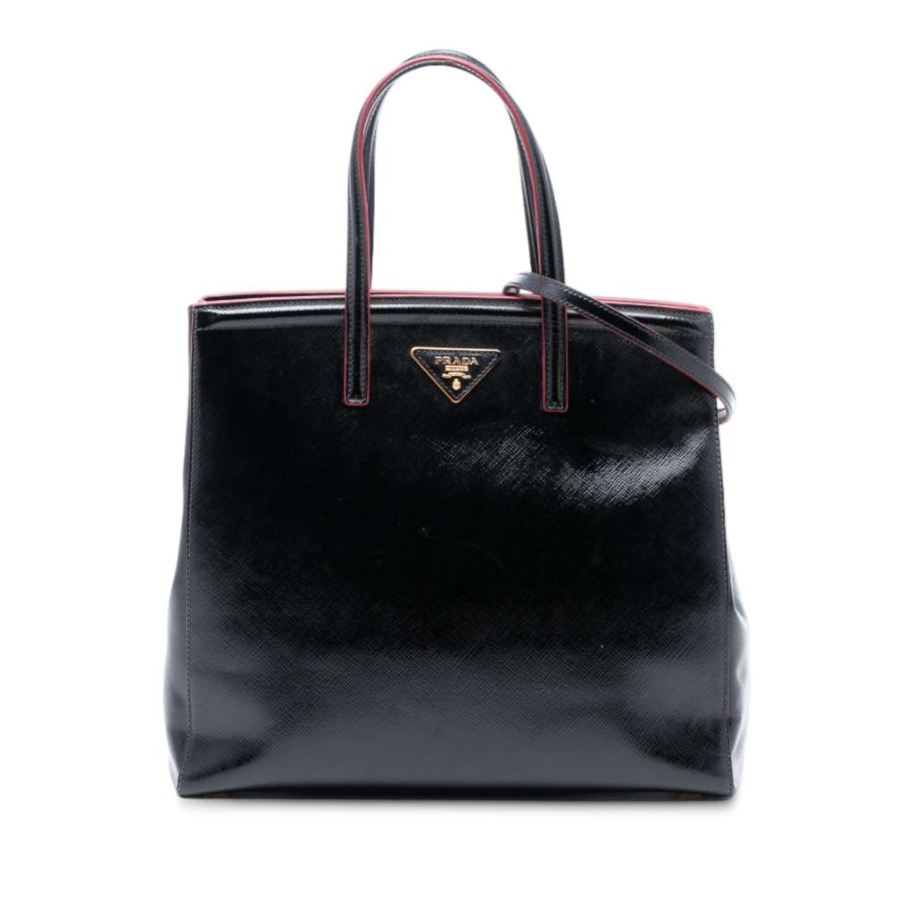 This satchel features a saffiano leather body, flat leather handles, a detachable flat leather strap, an open top with a magnetic snap button closure, and interior zip and slip pockets.