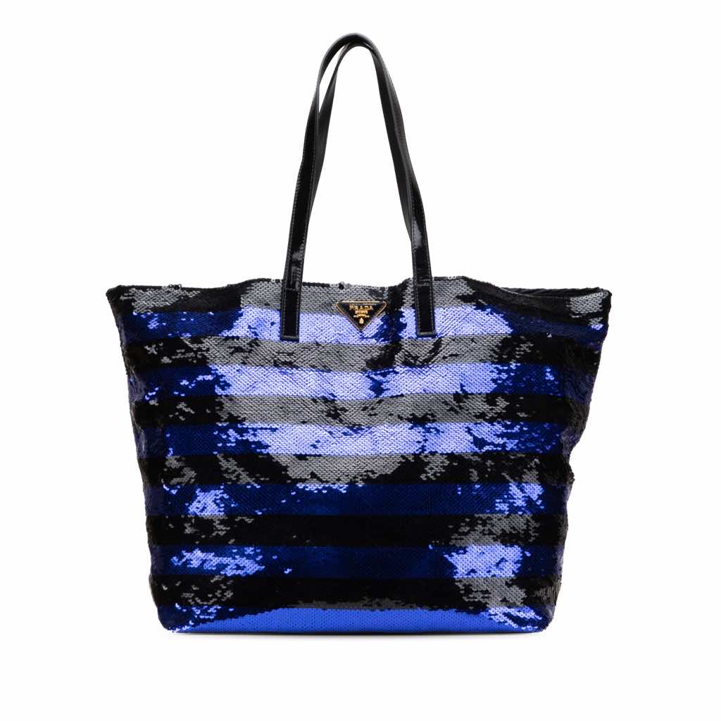 This tote bag features a satin body with sequins, flat leather handles, an open top, and an interior zip pocket.