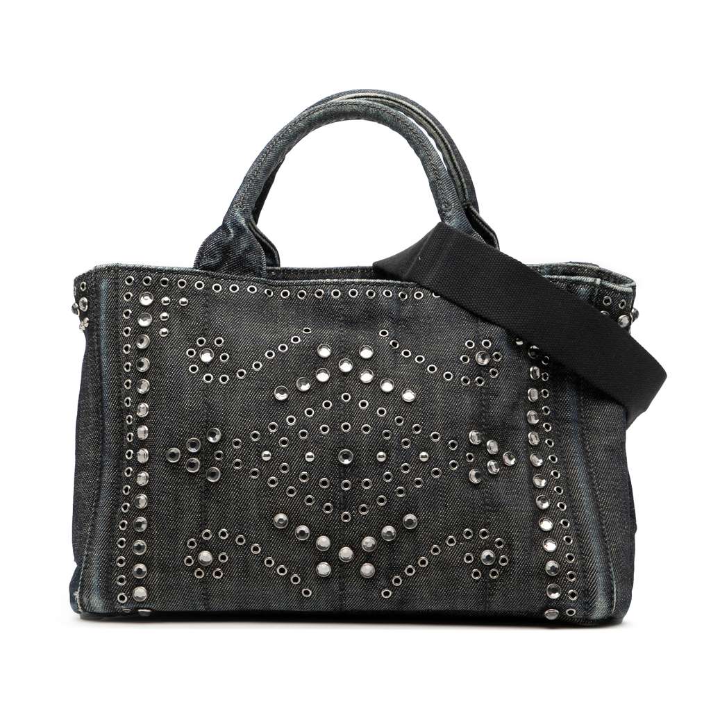 This satchel features a studded denim body, rolled top handles, a detachable flat canvas strap, an open top, and interior zip and slip pockets.