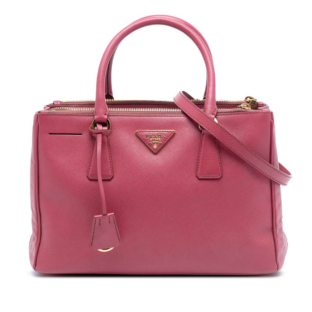 The Galleria satchel features a saffiano leather body, rolled leather handles, a detachable strap, an open top, dual zip compartments, and interior zip and slip pockets.