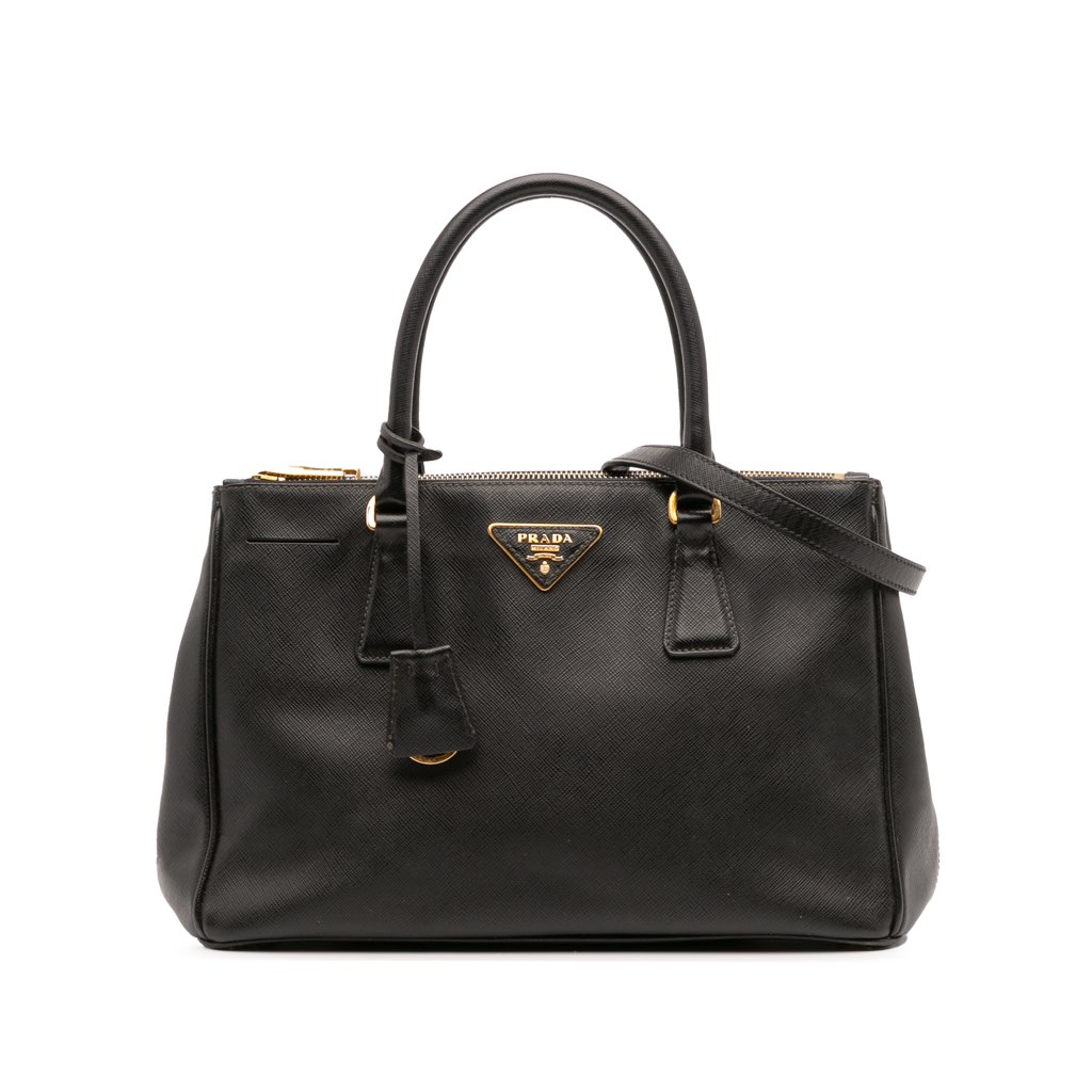 This satchel features a saffiano leather body, rolled leather handles, a detachable flat leather shoulder strap, an open top with magnetic snap closure, double zip compartments, and interior zip and slip pockets.