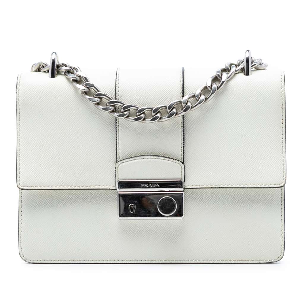 Prada Small Saffiano Sound Lock Chain Crossbody White Small