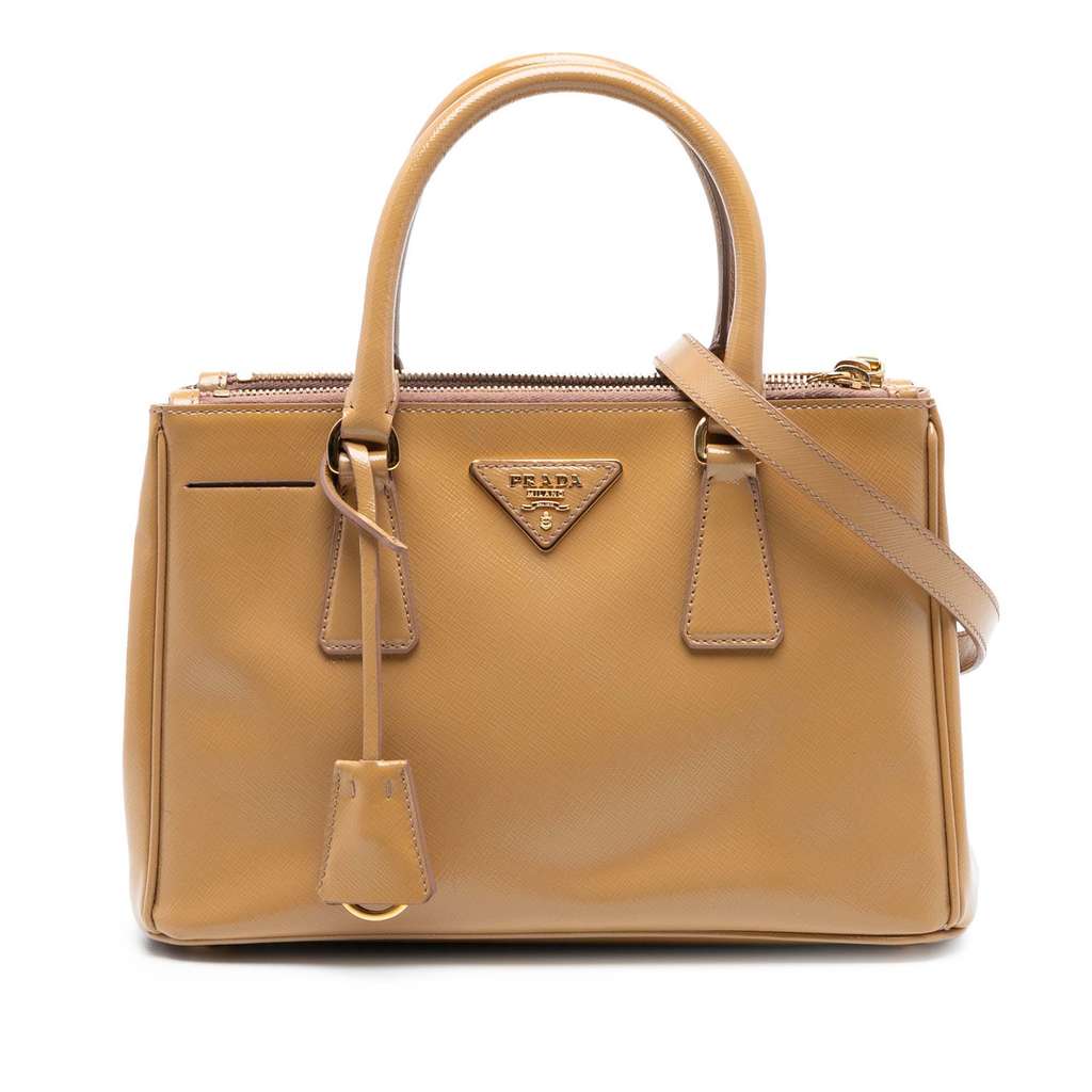 This satchel features a saffiano vernice leather body, rolled leather top handles, a detachable and adjustable flat leather shoulder strap, double top zip closures, and interior zip and slip pockets.