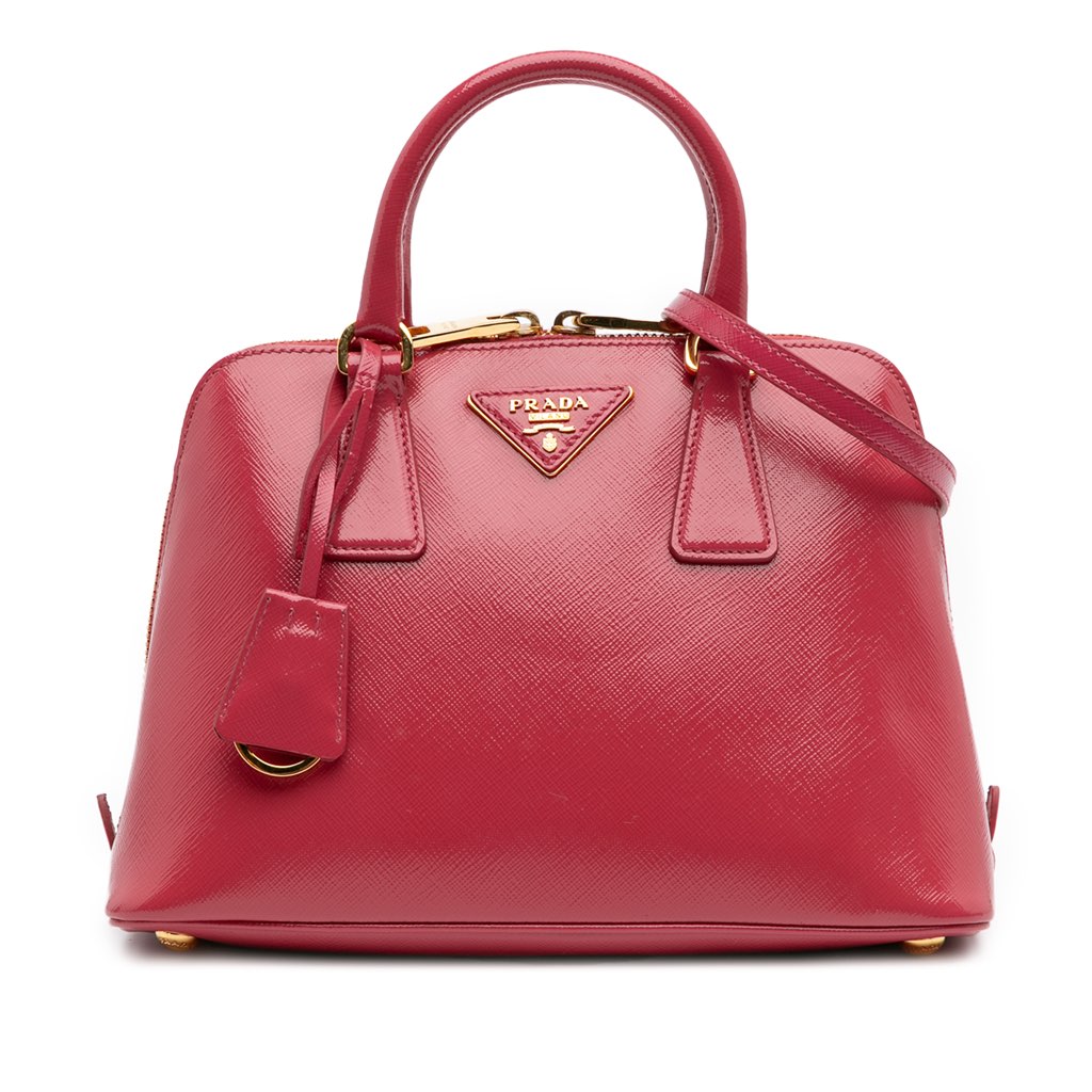 The Promenade satchel features a saffiano leather body, rolled handles, a detachable flat leather strap, a top zip closure, and interior zip and slip pockets.