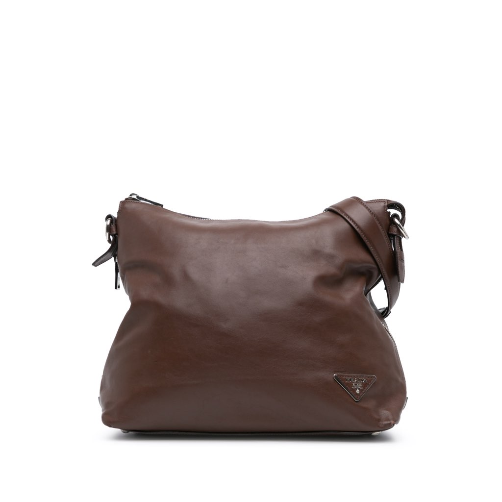 This shoulder bag features a leather body, a flat leather shoulder strap, a top zip closure, exterior side zip pockets, and an interior zip pocket.