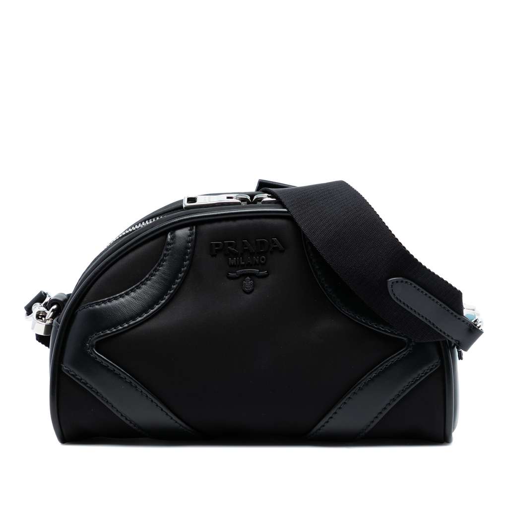 The bowling crossbody bag features a nylon body with leather body, a flat strap, and a top zip closure.