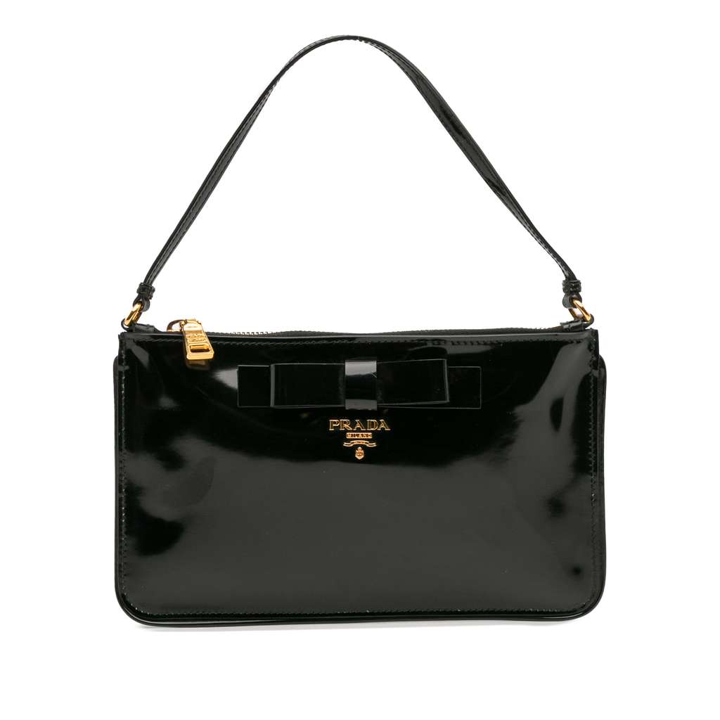 This shoulder bag features a patent leather body with bow detail, a flat leather strap, and a top zip closure.