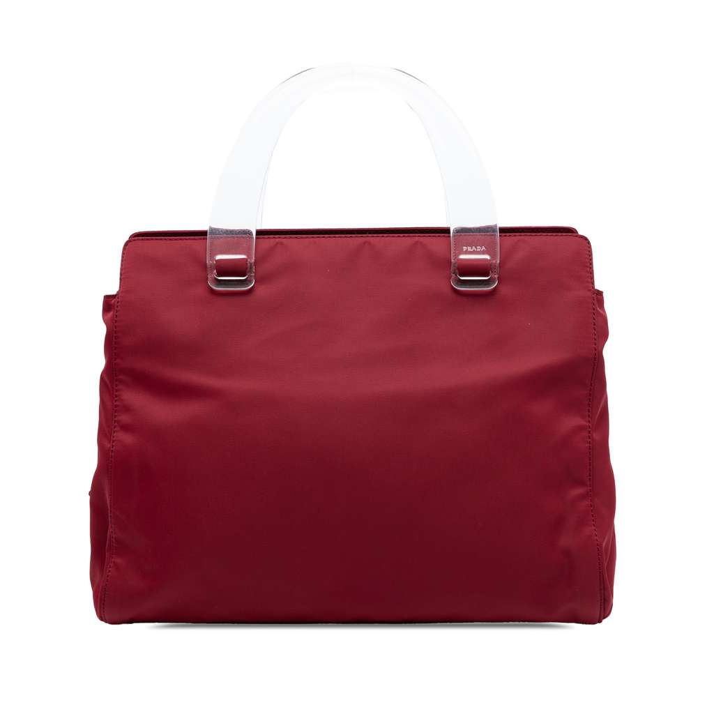 This handbag features a nylon body, acrylic handles, a top zip closure, an interior zip compartment, and an interior zip pocket.
