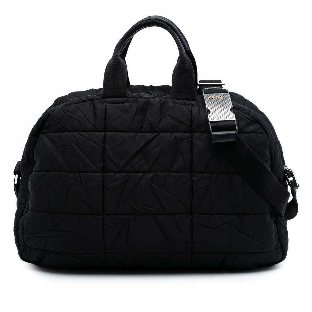 This travel bag features a quilted nylon body, rolled handles, a detachable strap, a top zip closure, and an interior zip pocket.