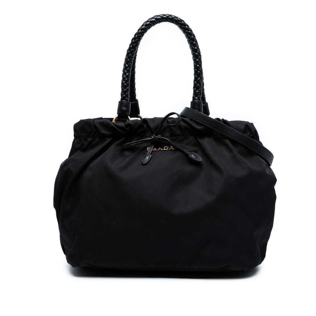 This satchel features a nylon body, braided leather handles, a top zip closure, and an interior zip pocket.