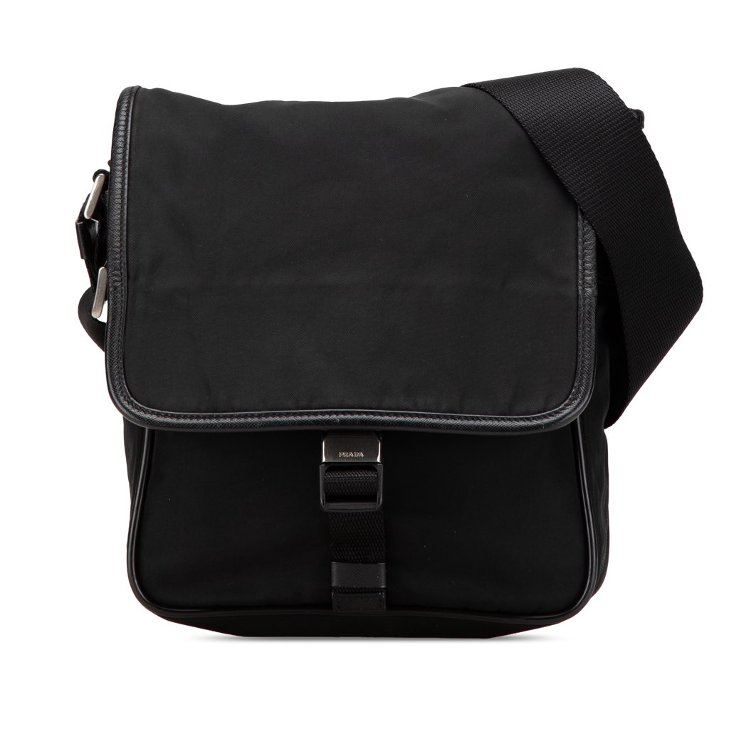 This crossbody features a nylon body with saffiano leather trim, an adjustable flat strap, a front flap with buckle closure, an exterior back zip pocket, and an interior zip pocket.