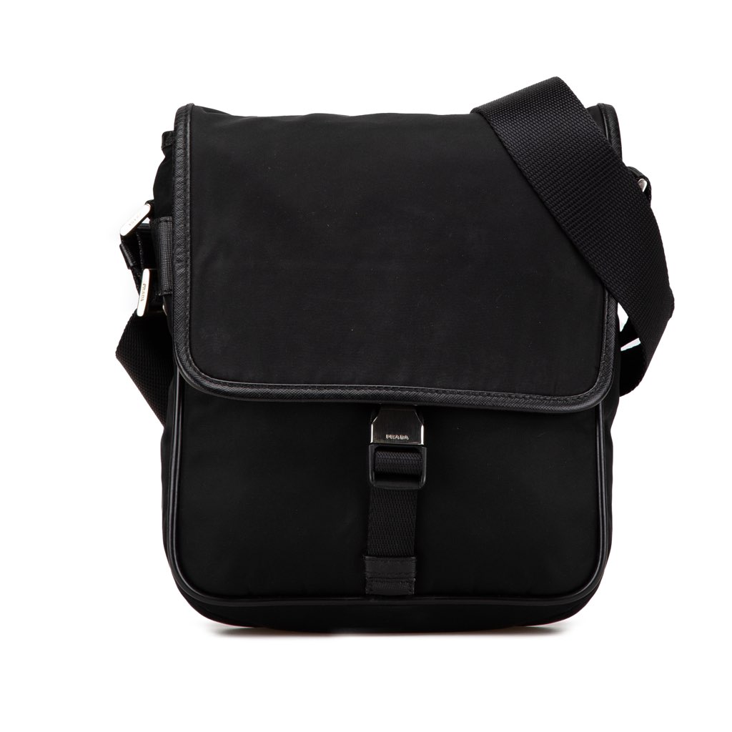 This crossbody features a nylon body with leather trim, a flat strap, a front flap with buckle closure, an exterior back zip pocket, and an interior zip pocket.