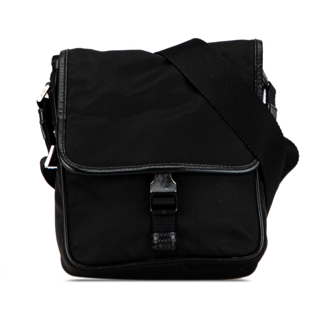 This crossbody features a nylon body with leather trim, an adjustable flat strap, a front flap with buckle closure, an exterior back zip pocket, and an interior zip pocket.