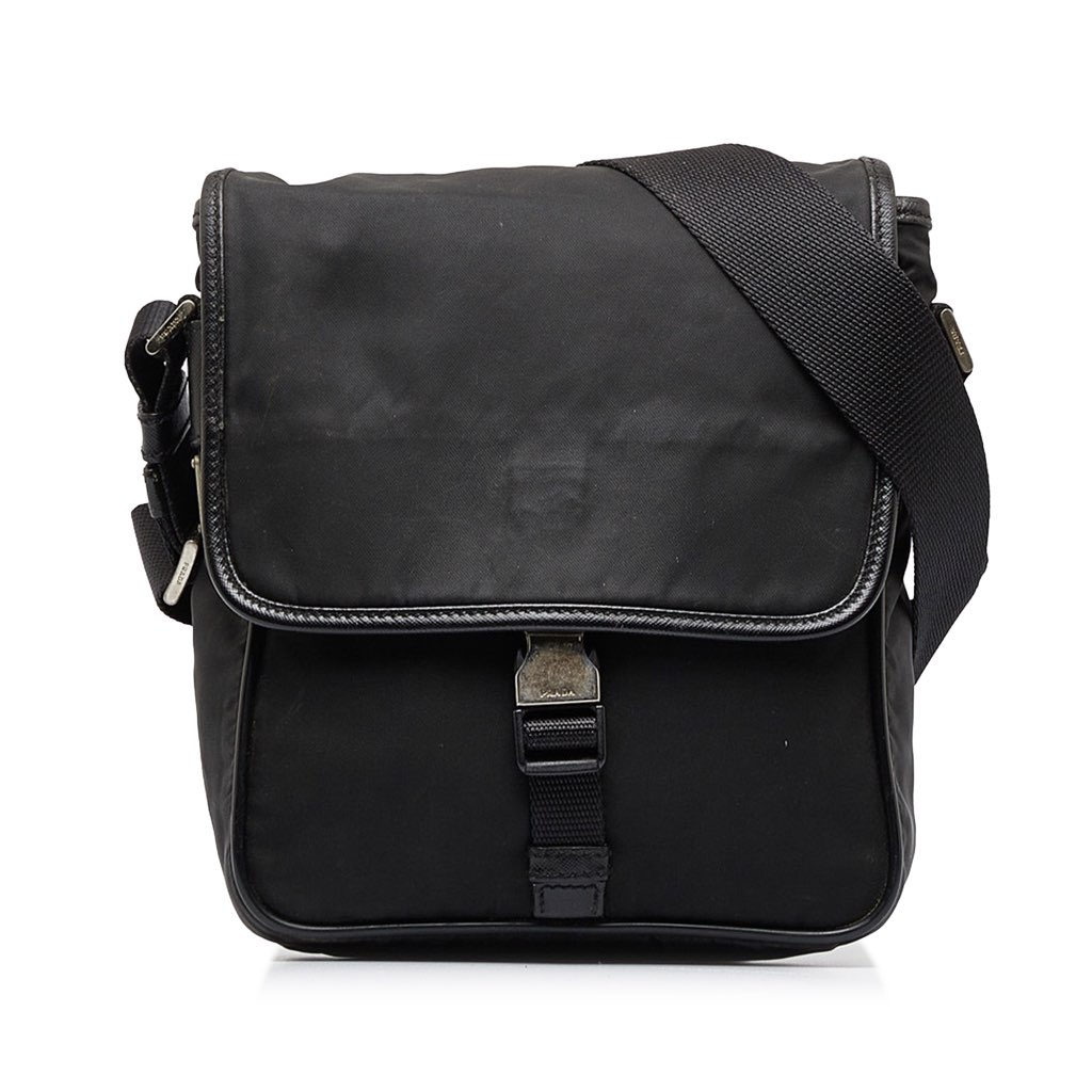 This crossbody features a nylon body, a flat strap, a top flap with buckle closure, and an interior zip pocket.