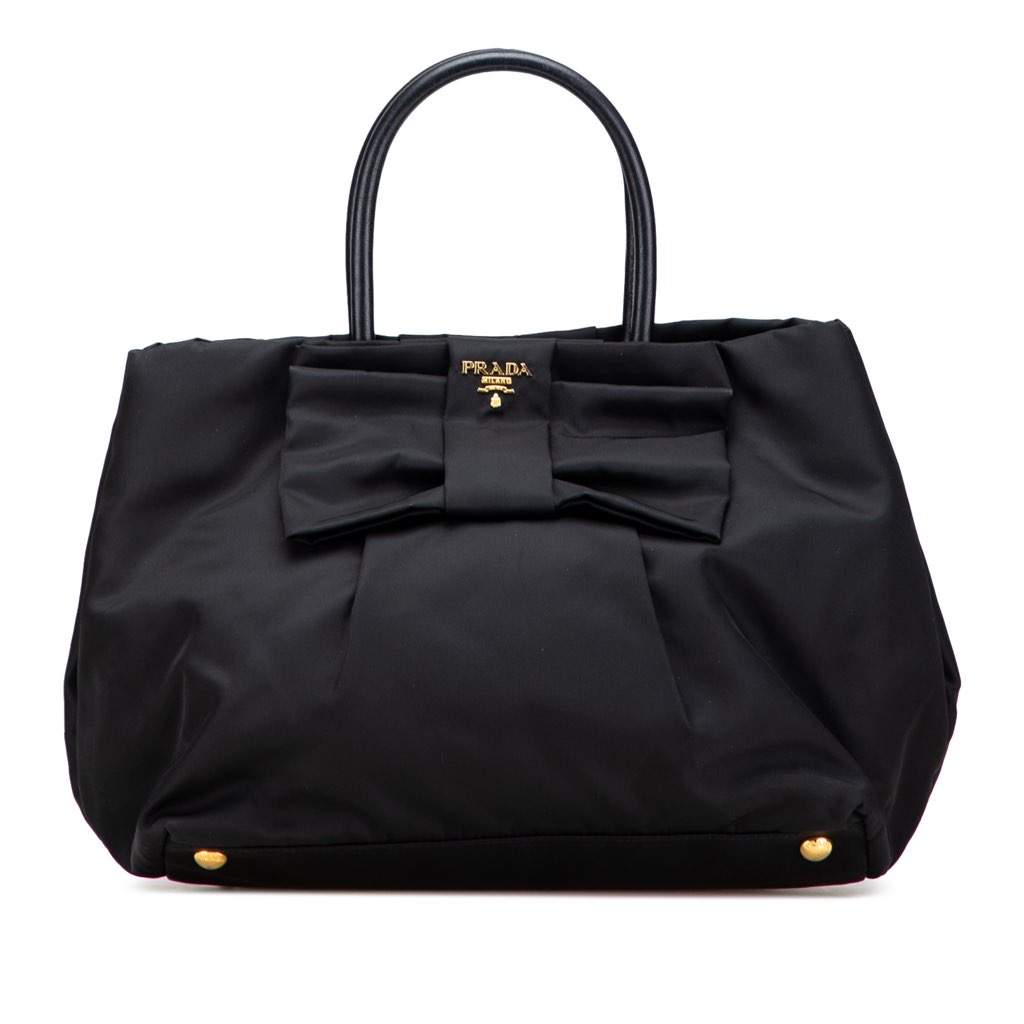 This tote bag features a nylon body, rolled leather handles, an open top with magnetic snap closure, and interior zip pockets.