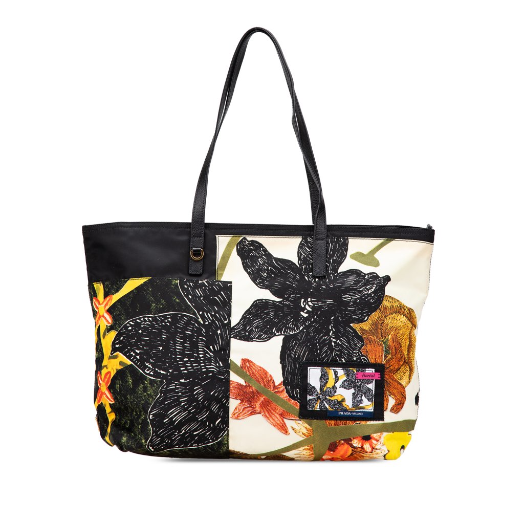 This tote features a printed nylon body, flat leather straps, a top zip closure, and an interior slip pocket.