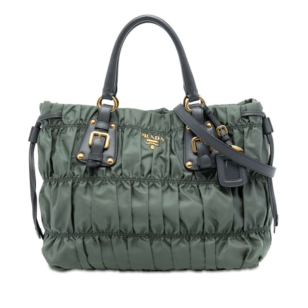 This satchel features a gathered nylon body, rolled leather handles, a detachable flat strap, an open top with magnetic snap button closure, and interior zip and slip pockets.