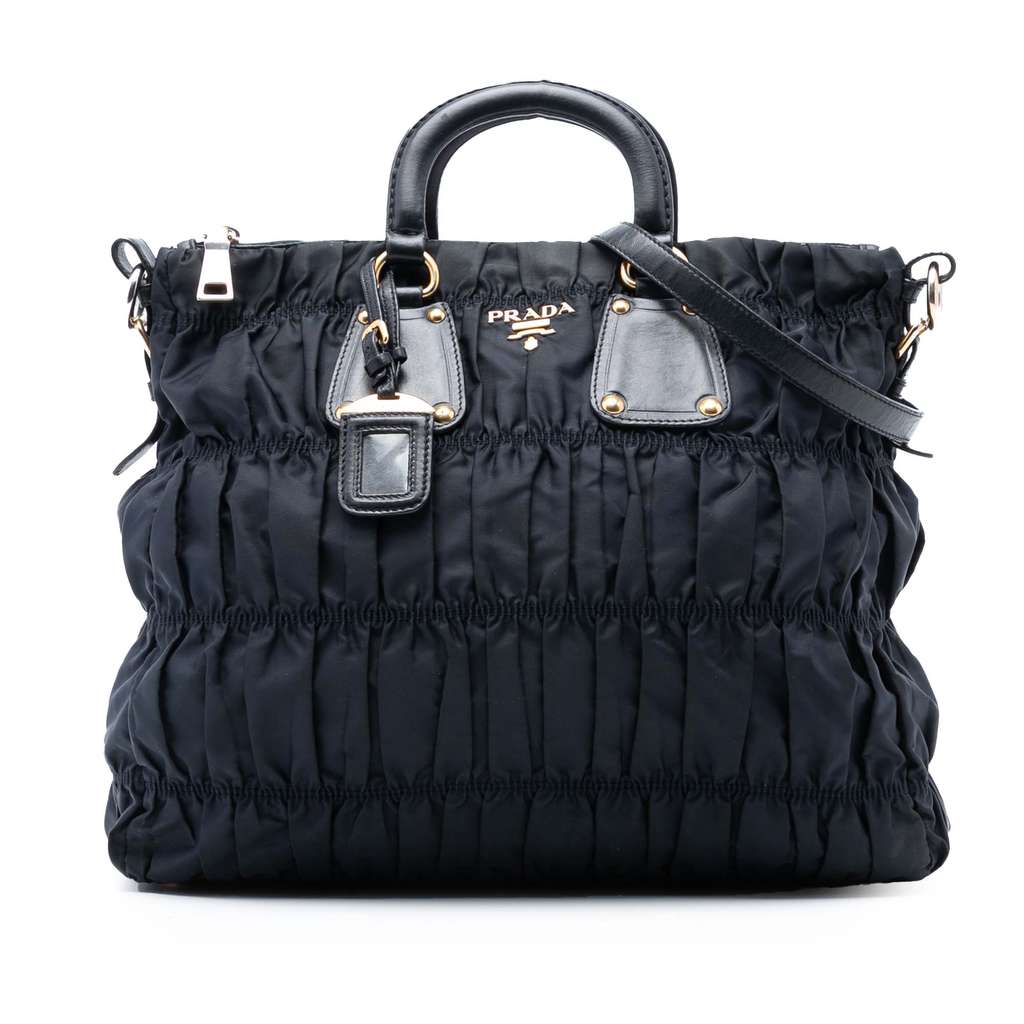 The Tessuto tote bag features a gathered nylon body, flat leather handles, a detachable flat leather strap, a top zip closure, and interior zip and slip pockets.